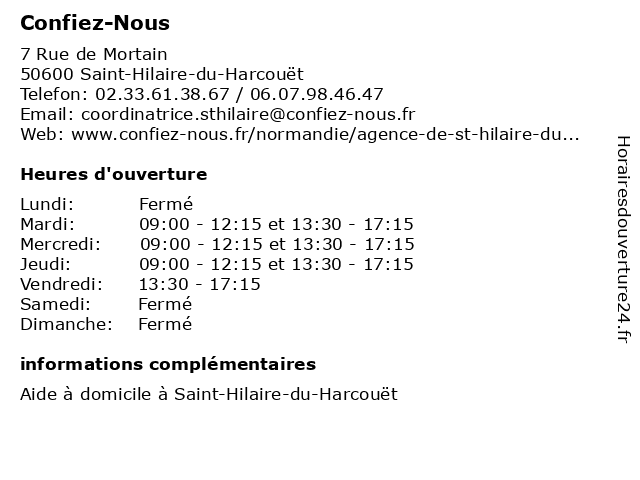 1 Confiez-Nous (Distance: 22,99 km) 20 Rue des Chapeliers, 50300 Avranches agence, aides, confiez, franchises, nous, personnes, services, siège 2 Confiez-Nous (Distance: 23,00 km) 10 Place du Marché, 50300 Avranches agence, aides, confiez, nous, personnes, services 3 Confiez-Nous (Distance: 26,23 km) 25 Rue Nationale, 35300 Fougères agence, aides, confiez, nous, personnes, services 5 Confiez-Nous (Distance: 30,50 km) 5 Rue du Docteur Havard, 50800 Villedieu-les-Poêles agence, aides, confiez, nous, personnes, services 6 Confiez-Nous (Distance: 45,08 km) 877 Rue des Écoles, 50400 Granville agence, aide, confiez, domicile, nous, personne, santé, services |