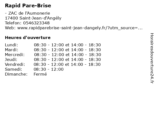 | 1 France Pare-Brise ST JEAN D'ANGELY (Distance: 1,31 km) 2 Rue Alex Dumas, 17400 Saint-Jean-d'Angély brise, changement pare-brise, d'angely, fissure pare-brise, france, glace latérale, impact pare-brise, jean, lunette arrière, pare, pare-brise, remplacement pare-brise, réparation pare-brise, st, vitre latérale, vitre voiture 2 Mondial Pare-Brise - Point Relais (Distance: 1,58 km) 2 Rue de l'Artisanat, 17400 Saint-Jean-d'Angély brise, mondial, pare, point, relais 3 France Pare Brise (Distance: 26,09 km) 2 Avenue de Gémozac, 17100 Saintes bris de glace, brise, france, pare, services 4 Rapid Pare-Brise Tonnay-Charente MECA AUTO 17 (Distance: 28,26 km) 49 Rue Charles De Gaulle, 17430 Tonnay Charente 17, auto, brise, charente, meca, pare, rapid, tonnay 5 France Pare Brise (Distance: 30,48 km) 79 Avenue de Saintes, 16100 Cognac bris de glace, brise, france, pare, services 6 Carglass (Distance: 31,12 km) 109 Avenue d'Aunis, 17430 Tonnay-Charente bris, carglass, pare-brise, remplacement |