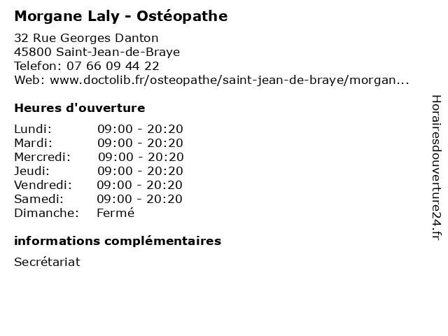 1 Morgane Laly - Ostéopathe (Distance: 7,96 km) 38 Rue des Petits Osiers, 45140 Saint-Jean-de-la-Ruelle laly, morgane, osteo, osteopathe, ostéopathe, sante, soins 2 Morgane Talaga - Masseur-kinésithérapeute (Distance: 16,67 km) 53 domaine de l'Ardoux, 45160 Ardon kiné, kinésithérapeute, masseur, morgane, rééducation, soin, talaga 3 Morgane Lebrun - Infirmière (Distance: 29,05 km) 1 Rue de L'abattoir, 45190 Beaugency infirmier, infirmiere, infirmière, lebrun, morgane, sante, soins 4 Dr Morgane Le Baut - Médecin généraliste (Distance: 34,44 km) 9 Bis Rue Des Mees, 41220 Saint-Laurent-Nouan baut, docteur, dr, generaliste, généraliste, le, medical, morgane, médecin, soin 6 |