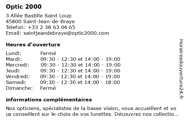 1 Optic 2000 (Distance: 0,02 km) 3 Allée Bastille Saint Loup, 45800 Saint-Jean-de-Braye 2000, lunettes, optic, santé, solaires 2 Optic 2000 (Distance: 3,04 km) 2 Rue de Montaran, 45400 Fleury-les-Aubrais 2000, lunettes, optic, santé, solaires 6 Opticien Orléans - Optic 2000 (Distance: 2,87 km) 13 Rue de la République, 45000 Orléans 2000, lentilles de contact, lunettes de soleil, lunettes de vue, optic, optic2000, opticien, opticien optic2000, orléans, ray-ban, rayban |