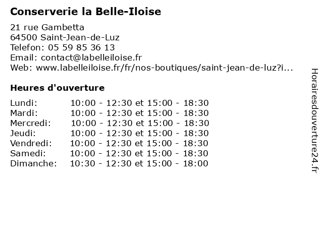 1 Conserverie la Belle-Iloise (Distance: 18,65 km) 35 Rue d'Espagne, 64100 Bayonne alimentation, belle, conserverie, conserves, iloise, la, magasin, plats cuisinés, sardines, thon 2 Conserverie Jean de Luz (Distance: 3,24 km) 3 Avenue de Jalday, 64500 Saint-Jean-de-Luz atisanale, bio, boîtes, conserverie, de, jean, jean-de-luz, luz, sardines 4 SILIGOM - CENTRE AUTO BELLE MARION (Distance: 16,73 km) 4 Avenue Belle Marion, 64600 Anglet auto, belle, centre, garage automobile anglet, marion, pneu 4 saisons anglet, pneu hiver anglet, pneu michelin anglet, pneu moto anglet, pneu pas cher anglet, promo pneu anglet, promotion pneu anglet, revision voiture anglet, siligom, vidange voiture anglet 5 Arnabar (Distance: 0,14 km) 15 Avenue Joachim Labrouche, 64500 Saint-Jean-de-Luz arnabar, canard, conserves, foie, gras, paté 6 Le Confit d'Ascain (Distance: 4,47 km) 677 Route de St-Jean-de-Luz, 64130 Ascain artisanale, boutique, confit, conserverie, d'ascain, enterprise, fine, le, épicerie |