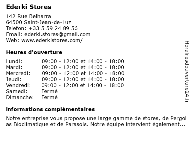 1 Stores Sol Y Sombra (Distance: 2,82 km) 5 Rue Ortz Adarra, 64500 Saint-Jean-de-Luz sol, sombra, stores 3 2am-Stores (Distance: 14,38 km) 23 chemin de Sabalce, 64100 Bayonne 2am, pergolas, portails, stores, stores exterieurs, volets roulants 4 Feralu (Distance: 8,64 km) 9 rue Chapelet, 64200 Biarritz fenêtres, feralu, fermetures, installation, menuiserie, portes, rénovation, stores 5 Gucci (Distance: 9,58 km) 13 George Clemenceau, 64200 Biarritz accessories, bags, boutique, gucci, stores 6 Adour PVC- A.N.C Diffusion (Distance: 14,73 km) 4 Rue Tour de Sault, 64100 Bayonne a.n.c, adour, diffusion, fabricant de stores, installations, menuiserie, pergolas, portail, pvc |