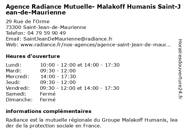 2 Mutuelle Entrenous (Distance: 0,18 km) 40 rue du Collège, 73300 Saint-Jean-de-Maurienne agence, entrenous, mutuelle, prevoyance 3 Agence Radiance Mutuelle - Malakoff Humanis Albertville (Distance: 44,36 km) 92 Rue de la République, 73200 Albertville agence, albertville, assurance santé, humanis, malakoff, mutuelle, prévoyance, radiance, retraite, santé 4 Agence Radiance Mutuelle - Malakoff Humanis Chambéry Colonne (Distance: 45,98 km) 20 Boulevard de la Colonne, 73000 Chambéry agence, assurance santé, chambéry, colonne, humanis, malakoff, mutuelle, prévoyance, radiance, retraite, santé 5 Agence Radiance Mutuelle - Malakoff Humanis Chambéry Rue Ronde (Distance: 46,66 km) 7 Rue Ronde, 73000 Chambéry agence, assurance santé, chambéry, humanis, malakoff, mutuelle, prévoyance, radiance, retraite, ronde, rue, santé 6 Délégation Entreprises Malakoff Humanis Annecy (Distance: 46,84 km) 343 Avenue du Comte Vert, 73000 Chambéry annecy, assurance santé, délégation, entreprises, humanis, malakoff, mutuelle, prévoyance, retraite, santé |