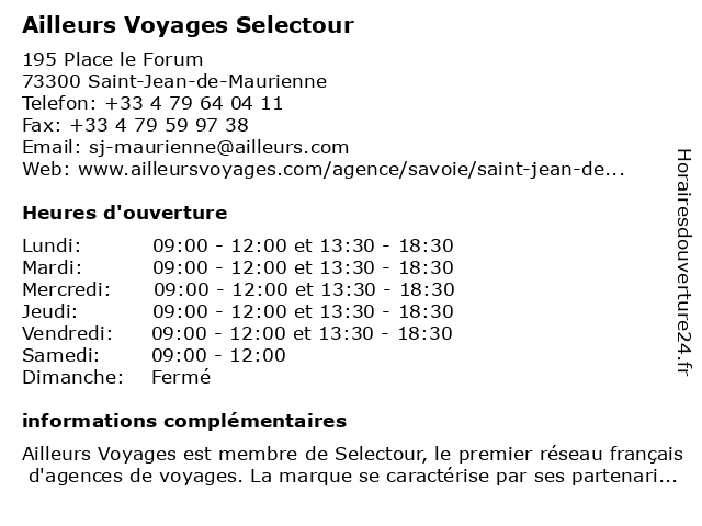 1 Jetset Voyages / Ailleurs Voyages (Distance: 0,18 km) - Saint Antoine, 73303 Saint-Jean-de-Maurienne agence, ailleurs, billet d'avion et hôtel pour votre club, jetset, séjour, voyages 2 Selectour - Ailleurs Voyages (Distance: 0,19 km) - Le Forum Saint Antoine, 73300 Saint-Jean-de-Maurienne ailleurs, billets de train, selectour, séjours, vols, voyage, voyages 3 Selectour - Europe Autocars Voyages (Distance: 25,71 km) - ZI des Moulins, 38830 Crêts-en-Belledonne autocars, billets de train, europe, selectour, séjours, vols, voyage, voyages 4 Selectour - Ici Voyages (Distance: 48,05 km) 18 Avenue Maurice Petsche, 05100 Briançon billets de train, ici, selectour, séjours, vols, voyage, voyages 5 Selectour - Ailleurs Voyages (Distance: 49,27 km) 13 Rue de La République, 38000 Grenoble ailleurs, billets de train, selectour, séjours, vols, voyage, voyages 6 Selectour - Ama Tourisme (Distance: 49,50 km) 2 Square Léon Martin, 38000 Grenoble ama, billets de train, selectour, séjours, tourisme, vols, voyage |