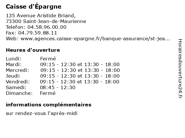 1 Caisse d'Épargne (Distance: 10,09 km) , Grande Rue,, 73130 La Chambre banque, caisse, carte, d'epargne, d'épargne, services 2 Caisse d'Épargne (Distance: 11,75 km) 23 Avenue de la République,, 73140 Saint-Michel-de-Maurienne banque, caisse, carte, d'epargne, d'épargne, services 3 Caisse D'Allocations Familiales (Caf) (Distance: 0,25 km) 95 Avenue Des Clappeys, 73300 Saint-Jean-de-Maurienne administration, assoc, caf, caisse, d'allocations, familiales, services, services publics 4 Caisse Primaire d'Assurance Maladie (CPAM) (Distance: 0,45 km) 16 Avenue Samuel-Pasquier, 73300 Saint-Jean-de-Maurienne administration, assoc, caisse, cpam, d'assurance, maladie, primaire, services, services publics 5 Groupama (Distance: 0,08 km) . Rue Ramassot, 73300 Saint-Jean-de-Maurienne agence, assurance, banque, crédits, groupama, prêts 6 Banque Laydernier (Distance: 0,21 km) 26 avenue Henri Falcoz, 73300 Saint-Jean-de-Maurienne agence, bancaire, banque, laydernier |