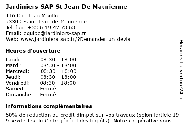 1 Avis Location Voiture - St Jean Maurienne (Distance: 0,29 km) 363 Rue des Chaudannes, 73300 Saint-Jean-de-Maurienne avis, jean, location, maurienne, st, voiture 2 GEMO ST JEAN DE MAURIENNE Chaussures et Vêtements (Distance: 0,57 km) Rue du Parquet, 73300 Saint-Jean-de-Maurienne bijoux et accesoires, chaussures, de, et, gemo, jean, lingerie, magasin bébé, maroquinerie, maurienne, mode et habillement, st, vêtements, vêtements bébé, vêtements enfant, vêtements femme, vêtements homme 3 Béton VICAT - St JEAN DE MAURIENNE (Distance: 0,63 km) Rue Henri Sainte-Claire Déville, 73300 Saint-Jean-de-Maurienne béton, de, jean, maurienne, st, vicat 4 MAAF Assurances ST JEAN DE MAURIENNE (Distance: 1,14 km) 153 Place Fodéré, 73300 Saint-Jean-de-Maurienne assurance, assurance auto, assurance habitation, assurance moto, assurance professionnelle, assurance prêt immobilier, assurances, crédit auto, de, jean, maaf, maurienne, mutuelle, mutuelle santé, st 5 Station Service Enilive - St Michel de Maurienne (Distance: 10,39 km) Autoroute de la Maurienne, 73140 Saint-Martin-d'Arc borne de gonflage, boutique, carburant, de, douches, enilive, fdj, gpl, lavage, maurienne, michel, nurserie, restauration, service, st, station, station-services, tables de pique-nique, toilettes, wifi 6 Jardiniers SAP St Michel De Maurienne (Distance: 10,41 km) 34 Avenue du Vigny, 73140 Saint-Michel-de-Maurienne de, jardiniers, maurienne, michel, sap, st |