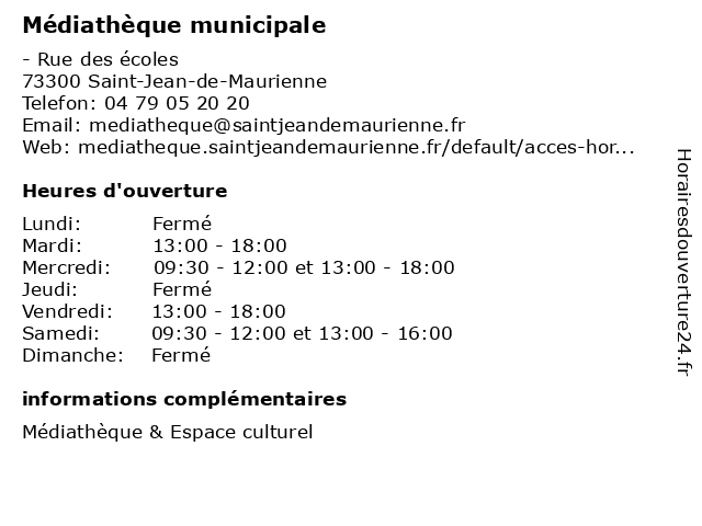 | Mercredi | 09:30-12:00 et 13:00-18:00 |