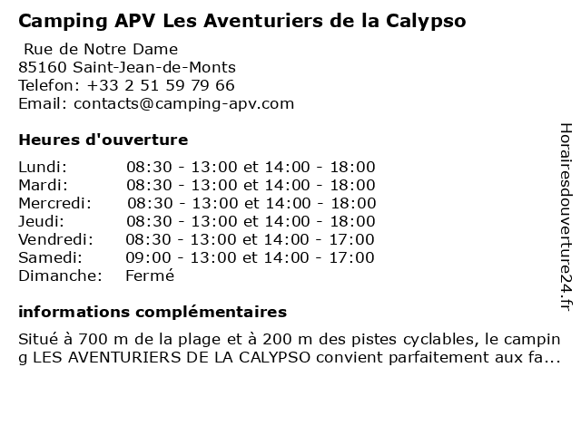 1 Camping Les Aventuriers de la Calypso (Distance: 0,42 km) - Route de Notre Dame de Monts, 85160 Saint Jean de Monts aventuriers, calypso, camping, de, hebergement, la, les, tourisme 2 Camping Les Aventuriers de la Calypso (Réception, basse saison) (Distance: 0,42 km) - Route de Notre Dame de Monts, 85160 Saint Jean de Monts aventuriers, basse, calypso, camping, de, hebergement, la, les, réception, saison, tourisme 3 Camping Les Aventuriers de la Calypso (Réception, haute saison) (Distance: 0,42 km) - Route de Notre Dame de Monts, 85160 Saint Jean de Monts aventuriers, calypso, camping, de, haute, hebergement, la, les, réception, saison, tourisme 4 Aire Park Réservation - Aire de services pour Camping-cars (Distance: 0,44 km) n/a Route de la tonnelle, 85167 Saint-Jean-de-Monts aire, arrêt, camping, camping car, cars, de, park, pour, repos, réservation, services, trajet, transports 5 Camping APV La Parée du Jonc (Distance: 0,76 km) Chemin de la Parée du Jonc, 85160 Saint-Jean-de-Monts apv, camping, du, jonc, la, parée 6 Camping La Parée du jonc (Réception, basse saison) (Distance: 0,77 km) - Chemin de la Parée du Jonc, 85160 Saint Jean de Monts basse, camping, du, hebergement, jonc, la, parée, réception, saison, tourisme |
