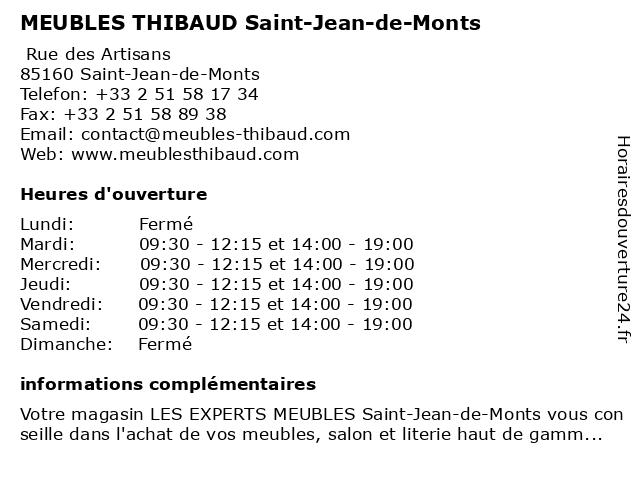 1 MEUBLES THIBAUD Saint-Jean-de-Monts (Distance: 0,03 km) Rue des Artisans, 85160 Saint-Jean-de-Monts armoire, buffet, canapé, chaise, de, jean, lit, matelas, meuble chambre à coucher, meuble de salle à manger, meubles, monts, rangement, saint, table, thibaud 2 Saint Jean Ameublement Thibaud (Distance: 0,02 km) 8 Rue des Artisans, 85160 Saint-Jean-de-Monts ameublement, jean, saint, thibaud 3 Thibaud'Construction (Distance: 6,84 km) 355 Route du Perrier, 85270 Saint-Hilaire-de-Riez thibaud'construction 4 Thibaud Gérald (Distance: 13,96 km) 89 Rue Carnot, 85300 Challans achats., bottes, chaussures, gérald, souliers, thibaud 5 Depot Vente Seguin Meubles (Distance: 15,80 km) 13 rue Menuisiers, 85800 Saint gilles croix de vie depot, meubles, seguin, vente 6 |