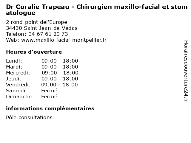 1 Dr Dimitri Pascual - Chirurgien maxillo-facial et stomatologue (Distance: 0,00 km) 2 Rond-Point de l'Europe, 34430 Saint-Jean-de-Védas chirurgie, chirurgien, dimitri, dr, et, facial, general, maxillo, pascual, soins, stomatologue 2 Dr Laure Frison - Chirurgien maxillo-facial et stomatologue (Distance: 0,01 km) 2 Rond-Point de l'Europe, 34430 Saint-Jean-de-Védas chirurgie, chirurgien, dr, et, facial, frison, general, laure, maxillo, soins, stomatologue 3 Dr Noémie Nieto - Chirurgien maxillo-facial et stomatol (Distance: 0,01 km) 2 Rond-Point de l'Europe, 34430 Saint-Jean-de-Védas chirurgie, chirurgien, dr, et, facial, general, maxillo, nieto, noémie, soins, stomatol 4 Coralie Bastos - Ostéopathe (Distance: 0,49 km) 171 Rue Pauline Kergomard, 34430 Saint-Jean-de-Védas bastos, coralie, docteur, médecin, médecine, ostéopathe, secrétariat 5 Maître Coralie Couderc - Avocate (Distance: 4,98 km) 14 rue André Michel, 34000 Montpellier avocate, avocats, civils, coralie, couderc, droits, juridiques, maître 6 Maître Coralie Meunier - Avocate (Distance: 5,47 km) 4 rue Astruc, 34000 Montpellier avocate, avocats, civils, coralie, droits, juridiques, maître, meunier |