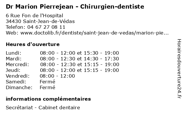 1 Dr Marion Peres - Chirurgien-dentiste (Distance: 0,93 km) - Rond-Point de l'Europe, 34430 Saint-Jean-de-Védas chirurgien, chirurgien-dentiste, dentiste, dr, marion, médecins, médicaments, peres, santé, secrétariat, spécialiste 2 Dr Marion Peres - Chirurgien-dentiste (Distance: 0,99 km) - Rond-Point de l'Europe, 34430 Saint-Jean-de-Védas chirurgien, dentaire, dentiste, dr, implantologie, marion, parodontologie, peres 3 Dr Marion Peres - Chirurgien-dentiste (Distance: 1,01 km) - Rond-Point de l'Europe, 34000 Saint-Jean-de-Védas chirurgien, consultation, dentiste, docteur, dr, marion, med, peres, secrétariat 4 Maître Marion Morana - Avocate (Distance: 2,13 km) 113 quai Jean Péridier, 34070 Montpellier avocate, avocats, civils, droits, juridiques, marion, maître, morana 5 Dr Marion Bertrand - Chirurgien orthopédiste (Distance: 2,25 km) 560 Avenue du Colonel André Pavelet, 34070 Montpellier bertrand, chirurgien, consultation, docteur, dr, marion, med, médecin, médecine, orthopédiste, traitement 6 Marion Morhain - Orthoptiste - Secretariat (Distance: 3,03 km) 57 Route de Lavérune, 34070 Montpellier cabinets, marion, morhain, médecins, orthoptiste, secretariat, thérapies |