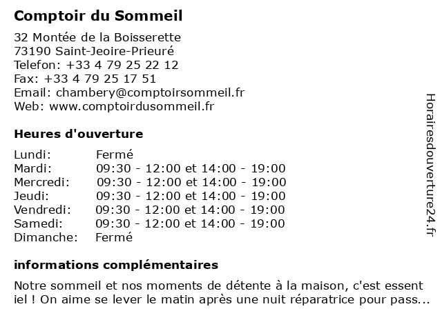 | Samedi | 09:30-12:00 et 14:00-19:00 |