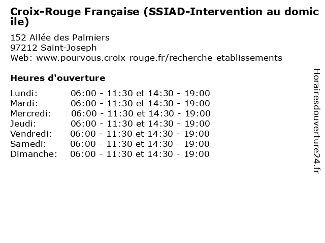 1 Croix-Rouge Française (SSIAD-Bureaux) (Distance: 0,00 km) 152 Allée des Palmiers, 97212 Saint-Joseph aide, bureaux, creche, croix, française, prévention, rouge, rééducation, santé, services, ssiad 2 Score Drive Terre Rouge (Distance: 13,40 km) 1 Lotissement de la Falasie, 97410 Saint Pierre alimentaire, courses, drive, rouge, score, supermarché, terre, épicerie 3 Ménage et repassage à domicile - Shiva La Réunion Le Tampon (Distance: 14,44 km) 74 Rue Marius et Ary Leblond, 97430 Le Tampon domicile, et, la, le, ménage, repassage, réunion, shiva, tampon 4 Croix-Rouge Française (ESA-Intervention) (Distance: 14,99 km) 288 Rue Jules Bertaut, 97430 Le Tampon aide, creche, croix, esa, française, intervention, prévention, rouge, rééducation, santé, services 5 Croix-Rouge Française (SSIAD-Bureaux) (Distance: 14,99 km) 288 Rue Jules Bertaut, 97430 Le Tampon aide, bureaux, creche, croix, française, prévention, rouge, rééducation, santé, services, ssiad 6 Croix-Rouge Française (SSIAD-Intervention) (Distance: 14,99 km) 288 Rue Jules Bertaut, 97430 Le Tampon aide, creche, croix, française, intervention, prévention, rouge, rééducation, santé, services, ssiad |