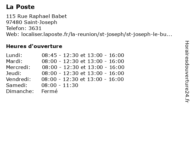 1 La Poste (Distance: 0,15 km) 88 Bis Route Nationale 2, 97480 Saint Joseph agence, colis, courriers, expédition, la, postale, poste, relais 2 La Poste (Distance: 0,45 km) 215 Rue Raphael Babet, 97480 Saint-Joseph agence, assurance, banque, banque postale, bureau de poste, chronopost, colis, courrier, dps, expéditions internationales, la, point, postale, poste, relais, timbres, téléphonie, ups, western union 3 La Poste (Distance: 3,18 km) - Rue de l'Ecole, 97480 Saint-Joseph colis, express chronopost, expédition, la, poste, réexpédition internationale, service, suivi du courrier 4 La Poste (Distance: 4,19 km) 90 Rue Hubert Delisle, 97480 Saint-Joseph colis, express chronopost, expédition, la, poste, réexpédition internationale, service, suivi du courrier 5 La Poste (Distance: 4,52 km) 58 Rue Amélie Lebon, 97480 Saint-Joseph agence, colis, courriers, expédition, la, postale, poste, relais 6 La Poste (Distance: 6,15 km) 2 Rue Alfred Isautier, 97429 Petite-Ile agence postale, courrier postal, expédition internationale, la, poste |