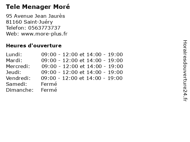 1 Moré (Distance: 0,00 km) 95 avenue Jean Jaurès, 81160 Saint-Juéry moré, plus, électroménager, équipement 4 Tele Menager More (Distance: 12,20 km) 49 Avenue Jean Jaures, 81400 Carmaux magasins, matériel, menager, more, radio, tele, télévision, électronique 5 Moré Plus (Distance: 12,21 km) 49 avenue Jean Jaurès, 81400 Carmaux moré, plus, électroménager, équipement 6 |