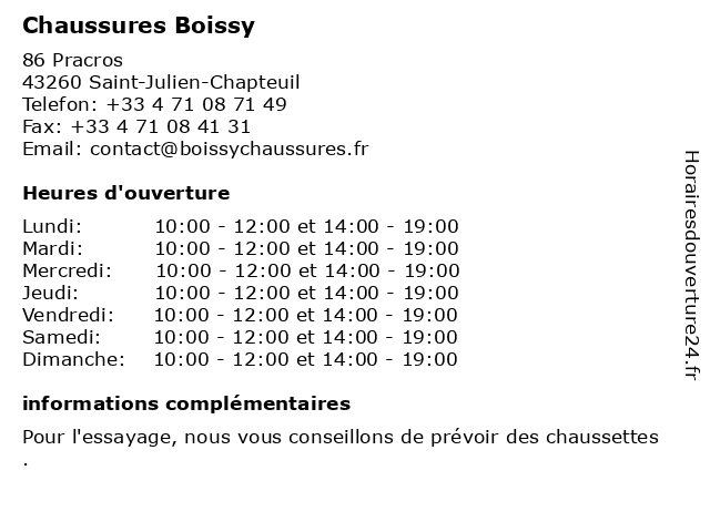 1 GEMO LE PUY EN VELAY-BRIVES CHAREN. Chaussures et Vêtements (Distance: 12,64 km) 3 Côte de Tireboeuf, 43700 Brives-Charensac bijoux et accesoires, brives, charen., chaussures, en, et, gemo, le, lingerie, magasin bébé, maroquinerie, mode et habillement, puy, velay, vêtements, vêtements bébé, vêtements enfant, vêtements femme, vêtements homme 2 Breysse Moulin Chaussures (Distance: 14,14 km) 3 Place du Maréchal Foch, 43200 Yssingeaux accessoires, ballerines, breysse, chaussures, moulin, sandales, tennis 3 Chaussures Orpaires (Distance: 14,32 km) - Zone de Villeneuve, 43200 Yssingeaux accessoires, ballerines, chaussures, orpaires, sandales, tennis 4 Karston Chaussures (Distance: 14,75 km) 6 Rue Saint Jacques, 43000 Le Puy-en-Velay accessoires, chaussures, karston, magasin, sacs 5 Miellerie de Boissy (Distance: 29,22 km) 485 route de Chaussinand, 07160 Accons accons, agriculture, biologique, boissy, de, miel, miellerie 6 Moulin Chausseur (Distance: 14,45 km) 5 Boulevard Maréchal Fayolle, 43000 Le Puy-en-Velay accessoires, boutique, chausseur, chaussures, mode, moulin, vêtements |