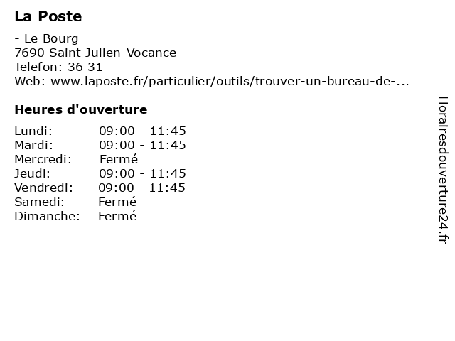 1 La Poste (Distance: 0,30 km) - Place de l'Église, 07690 Vanosc agence, assurance, banque, banque postale, bureau de poste, chronopost, colis, courrier, dps, expéditions internationales, la, point, postale, poste, relais, timbres, téléphonie, ups, western union 2 La Poste (Distance: 3,49 km) 23 Montée de l'Eglise, 07690 Vocance agence, assurance, banque, banque postale, bureau de poste, chronopost, colis, courrier, dps, expéditions internationales, la, point, postale, poste, relais, timbres, téléphonie, ups, western union 3 La Poste (Distance: 3,69 km) 60 Rue de la Libération, 07690 Villevocance agence, assurance, banque, banque postale, bureau de poste, chronopost, colis, courrier, dps, expéditions internationales, la, point, postale, poste, relais, timbres, téléphonie, ups, western union 4 La Poste (Distance: 5,05 km) - Le Village, 07690 Saint-Julien-Vocance agence, colis, courriers, expédition, la, postale, poste, relais 5 La Poste (Distance: 9,52 km) - Rue des Cévennes, 07520 Lalouvesc agence, assurance, banque, banque postale, bureau de poste, chronopost, colis, courrier, dps, expéditions internationales, la, point, postale, poste, relais, timbres, téléphonie, ups, western union 6 La Poste (Distance: 10,39 km) 25 Place de l'Église, 07290 Quintenas agence, assurance, banque, banque postale, bureau de poste, chronopost, colis, courrier, dps, expéditions internationales, la, point, postale, poste, relais, timbres, téléphonie, ups, western union |