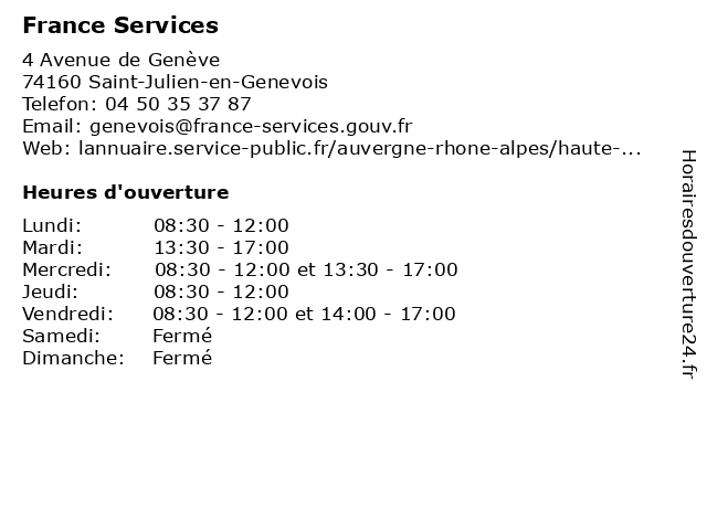 1 France Services (Distance: 11,81 km) 94 Avenue de la République, 01630 Saint-Genis-Pouilly administration, communes, france, service, services, services publics 2 France Services (Distance: 18,10 km) - Route de Thorens, 74570 Thorens-Glières administration, communes, france, service, services, services publics 3 France Services (Distance: 18,43 km) 67 Rue de la Poste, 74270 Frangy administration, communes, france, service, services, services publics 4 Sous-Préfecture (Distance: 0,02 km) 4 avenue de Genève, 74164 Saint-julien-en-genevois administration, assoc, préfecture, services, services publics, sous 5 Caisse D'Allocations Familiales (Distance: 0,09 km) 3 Rue Du Jura, 74160 Saint-Julien-en-Genevois administration, assoc, caisse, d'allocations, familiales, services, services publics 6 Immo de France - 4807 Immobilier (Distance: 0,29 km) 6 Bis grande Rue, 74160 Saint-Julien-en-Genevois 4807, agence, de, france, immo, immobilier, immobiliere |