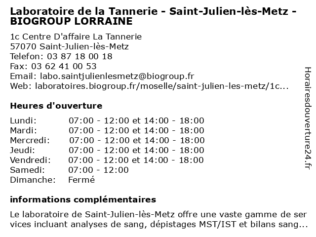 1 Crédit Agricole Lorraine (Distance: 0,08 km) 18 Rue La Tannerie, 57070 Saint-Julien-les-Metz agence, agricole, assurance, bancaire, banque, crédit, lorraine 2 Banque Populaire Alsace Lorraine Champagne (Distance: 0,11 km) 6 rue François Simon, 57070 St-Julien les Metz alsace, assurances, banque, champagne, lorraine, populaire 3 Pharmacie de La Tannerie (Distance: 0,14 km) 3 rue François Simon, 57070 Saint Julien Les Metz de, homéopathie, la, médicaments, orthopédie, parapharmacie, pharmacie, tannerie 4 Laboratoire du Boulevard de Trèves - Metz - BIOGROUP LORRAINE (Distance: 0,73 km) 5 Boulevard De Trèves, 57070 Metz biogroup, boulevard, de, du, dépistages, laboratoire, laboratoire de diagnostic, lorraine, metz, trèves 5 Laboratoire Barbier (Distance: 2,09 km) 26 Rue Du Neufbourg, 57000 Metz barbier, bureau, consultation, dr, laboratoire, maladie, med, médecin, médecine, pratique, thérapie, traitement 6 Laboratoire Christine Scheppler (Distance: 2,69 km) 24 Route De Lorry, 57050 Metz Devant Les Ponts bureau, christine, consultation, dr, laboratoire, maladie, med, médecin, médecine, pratique, scheppler, thérapie, traitement |