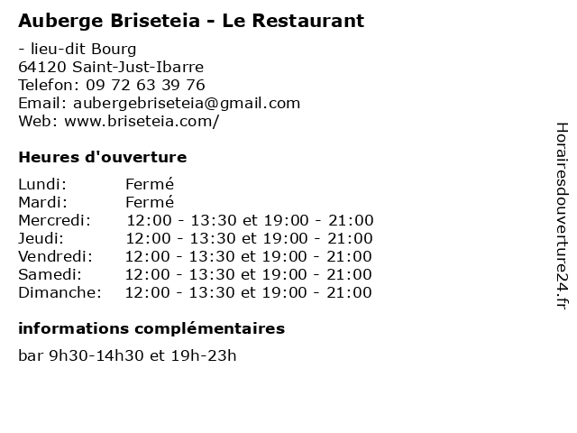 1 Auberge Briseteia (Distance: 0,00 km) - Le Bourg, 64120 Saint-Just-Ibarre adiskide, auberge, briseteia, platane, restaurants 3 Logis Auberge Denena (Distance: 16,25 km) 29 Rue Etxe Goxoak, 64120 Aïcirits-Camou-Suhast auberge, bar, denena, hotel, logis, restaurant, réunions, évenements 5 Auberge Portalenia (Distance: 16,35 km) 125 Place du Foirail, 64120 Garris auberge, berhouet, henri, portalenia, restaurants 6 Hôtel Auberge Mendi Alde (Distance: 19,19 km) - Place de l'Eglise, 64780 Osses alde, auberge, bar, hotel, hôtel, logis, mendi, restaurant, réunions, évenements |