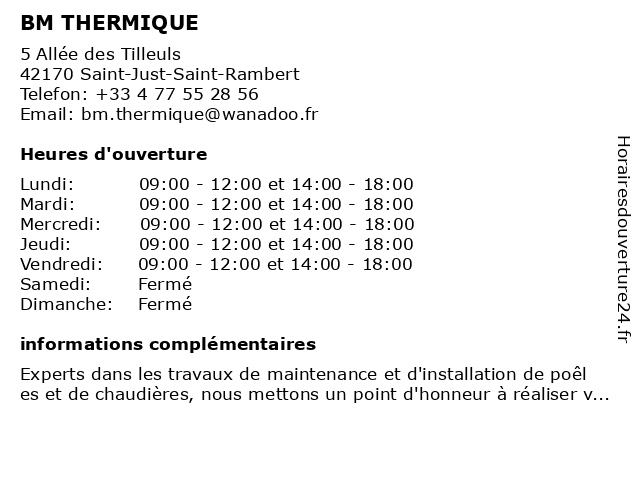 1 Confort Thermique (Distance: 1,89 km) 51 Avenue des Barques, 42170 Saint-Just-Saint-Rambert confort, thermique 2 S.M.T. (Société de Maintenance Thermique) (Distance: 4,03 km) 117 avenue du 8 Mai 1945, 42340 VEAUCHE chaudière, chauffage, climatisation, de, maintenance, plomberie, ramonage, s.m.t., société, thermique, zinguerie 3 BM Auto Et Associés (Distance: 11,64 km) 4 Rue des Piqueurs de Fond, 42230 Roche-la-Molière associés, auto, bm, et 4 ASTB - Analyse et Suivi Thermique du Bâtiment (Distance: 13,89 km) 1 boulevard Dalgabio, 42000 Saint-Etienne analyse, astb, bâtiment, du, et, suivi, thermique 5 Société Thermique d'Economie d'Energie - STEE (Distance: 14,64 km) 3 Rue Badiou, 42100 Saint-Étienne chaudière, chauffage, d'economie, d'energie, dépannage, société, société thermique d'economie d'energie, stee, thermique 6 Hervé Thermique (Distance: 14,96 km) 237 Rue du Puits Lacroix, 42650 Saint-Jean-Bonnefonds hervé, thermique |
