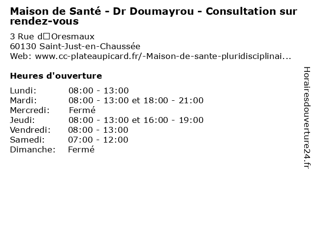 1 Maison de Santé - Dr Denancy - Consultation libre (Ansauvillers) (Distance: 0,00 km) 3 Rue d’Oresmaux, 60130 Saint-Just-en-Chaussée ansauvillers, bureau, consultation, de, denancy, dr, libre, maison, maladie, med, médecin, médecine, pratique, santé, thérapie, traitement 2 Maison de Santé - Dr Denancy - Consultation libre (Maison de Santé) (Distance: 0,00 km) 3 Rue d’Oresmaux, 60130 Saint-Just-en-Chaussée bureau, consultation, de, denancy, dr, libre, maison, maladie, med, médecin, médecine, pratique, santé, thérapie, traitement 3 Maison de Santé - Dr Denancy - Consultation sur rendez-vous (Maison de Santé) (Distance: 0,00 km) 3 Rue d’Oresmaux, 60130 Saint-Just-en-Chaussée bureau, consultation, de, denancy, dr, maison, maladie, med, médecin, médecine, pratique, rendez, santé, sur, thérapie, traitement, vous 4 Maison de Santé - Dr Denancy - Consultation sur rendez-vous (Ansauvillers) (Distance: 0,00 km) 3 Rue d’Oresmaux, 60130 Saint-Just-en-Chaussée ansauvillers, bureau, consultation, de, denancy, dr, maison, maladie, med, médecin, médecine, pratique, rendez, santé, sur, thérapie, traitement, vous 5 Maison de Santé - Dr Denancy - Consultation sur rendez-vous (Distance: 0,00 km) 3 Rue d’Oresmaux, 60130 Saint-Just-en-Chaussée bureau, consultation, de, denancy, dr, maison, maladie, med, médecin, médecine, pratique, rendez, santé, sur, thérapie, traitement, vous 6 Dr. Nicolas Cacheux - Médecine générale (Consultation sur rendez-vous) (Distance: 7,05 km) 2 Rue François-Métterrand, 60420 Maignelay-Montigny cacheux, consultation, docteur, dr., générale, medecins, médecine, nicolas, rendez, santé, sur, vous |