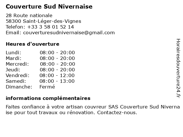 1 Communauté de Communes - Sud Nivernais (Distance: 1,94 km) 2 La Jonction, 58300 Décize administration, communauté, communes, de, du, nivernais, services publics, sud 2 Agenda Diagnostics 58 Sud (Distance: 2,32 km) 119 Avenue de Verdun, 58300 Decize 58, agenda, diagnostics, sud 3 Maçonnerie couverture decize Lenhartova (Distance: 5,10 km) 5 Tinte, 58300 Sougy-sur-Loire couverture, decize, lenhartova, maçonnerie 4 Sud Est Restauration s e r (Distance: 5,37 km) Mapad Maison Des Roses, 58260 La Machine restaurants, restauration 5 Sud Est Restauration s e r (Distance: 17,14 km) Residence Pierre Beregovo, 58160 Imphy restaurants, restauration 6 Charpente Couverture Nivernaise (Distance: 19,09 km) 27 Rue de la Badelle, 58270 Saint-Benin-d'Azy charpente, couverture, nivernaise |