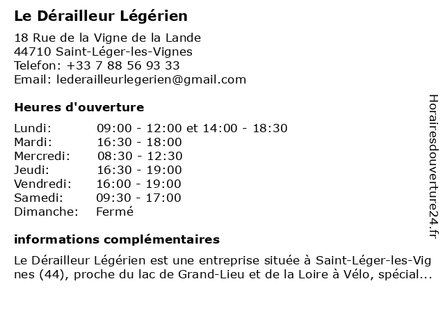 Le Dérailleur Légérien est une entreprise située à Saint-Léger-les-Vignes (44), proche du lac de Grand-Lieu et de la Loire à Vélo, spécialisée dans la réparation et l'entretien de vél...
