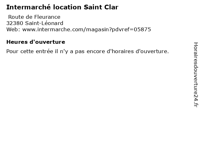1 Intermarché station-service Saint-clar (Distance: nan km) Route de Fleurance, 32380 Saint-Léonard clar, intermarché, saint, service, station 2 Intermarché CONTACT Saint Clar (Distance: nan km) 3 Route de Fleurance, 32380 Saint-Léonard clar, contact, intermarché, saint 3 Intermarché station-service Saint-clar (Distance: 0,01 km) Avenue de Gascogne, 32380 Saint-Clar clar, intermarché, saint, service, station 4 Carrefour Location Market (Distance: 8,81 km) n/a Route de Lectoure, 32500 Fleurance automobiles, carrefour, déménagements, location, market, véhicules 5 Intermarché (Distance: 9,05 km) - Fleurance, 32380 Saint-clar intermarché, la fraîcheur, la qualité de leurs produits, supermarchés 6 Intermarché station-service Lectoure (Distance: 11,16 km) Route d'Agen, 32700 Lectoure intermarché, lectoure, service, station |