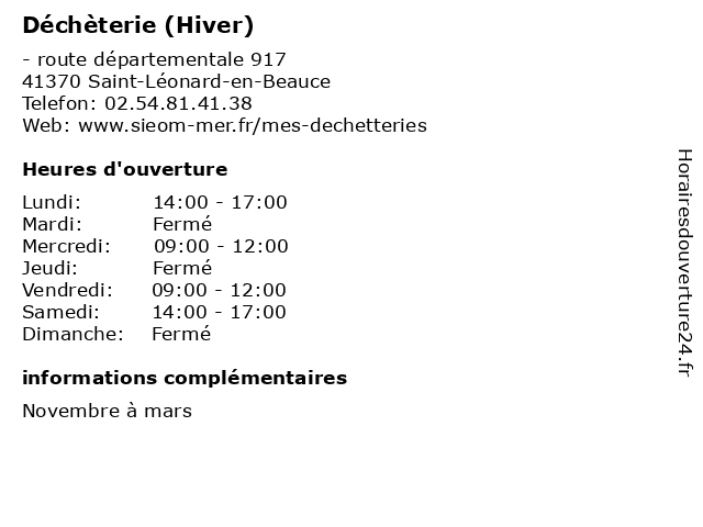 1 Déchèterie (Hiver) (Distance: 0,86 km) - lieu-dit Les Boulettes, 41370 Josnes bennes, débarras, déchèterie, détritus, hiver, ordures 2 Déchèterie (Hiver) (Distance: 8,15 km) - route de Talcy, 41500 Mer bennes, débarras, déchèterie, détritus, hiver, ordures 3 Déchèterie (Hiver) (Distance: 12,79 km) - rue du Pré Château, 41220 Saint-Laurent-Nouan bennes, débarras, déchèterie, détritus, hiver, ordures 4 Déchèterie (Hiver) (Distance: 14,99 km) - lieu-dit les Gribouzys, 41500 Suèvres bennes, débarras, déchèterie, détritus, hiver, ordures 5 Déchèterie (Été) (Distance: 0,00 km) - route départementale 917, 41370 Saint-Léonard-en-Beauce bennes, débarras, déchèterie, détritus, ordures, été 6 Déchèterie (Été) (Distance: 0,86 km) - lieu-dit Les Boulettes, 41370 Josnes bennes, débarras, déchèterie, détritus, ordures, été |
