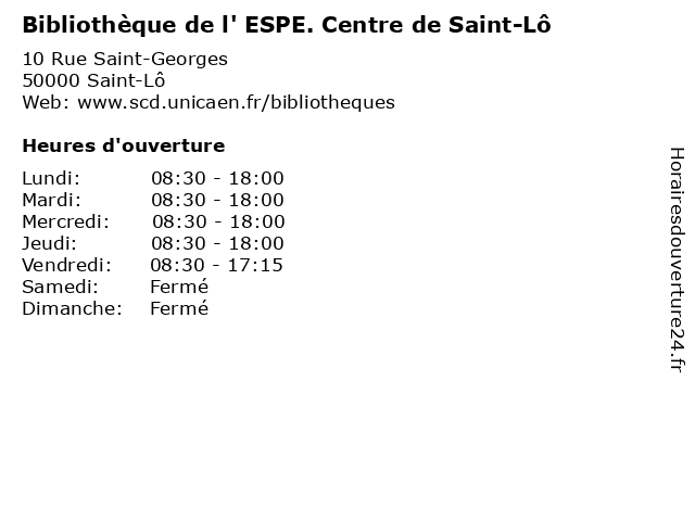 1 Espe-académie de Caen (Distance: 0,08 km) 10 rue Saint-Georges, 50000 Saint-Lô académie, caen, de, espe, manifestations scientifiques, publications 2 Bibliothèque du Bouloir (Distance: 0,77 km) 48 bis boulevard du Midi, 50000 Saint-Lô bibliothèque, bouloir, cd, du, dvd, jeux videos, livres, revues 3 Bibliothèque du Site Universitaire de Saint-Lô (Distance: 1,02 km) 120 Rue de l'Exode, 50000 Saint-Lô bibliothèque, de, du, livre, lô, médiathèque, saint, services, site, universitaire, université 4 Bibliothèque du Chat perché (Distance: 1,74 km) 45 Avenue des Tilleuls, 50000 Saint-Lô albums, bibliothèque, chat, documentaires, du, magazines, perché, romans 5 Bibliothèque du Chat perché (Distance: 1,74 km) 45 Avenue des Tilleuls, 50000 Saint-Lô albums, bibliothèque, chat, documentaires, du, magazines, perché, romans 6 Bibliothèque Universitaire Droit-lettres (Distance: 53,49 km) . Esplanade de la Paix, 14032 Caen bibliothèque, droit, lettres, livre, médiathèque, services, universitaire, université |