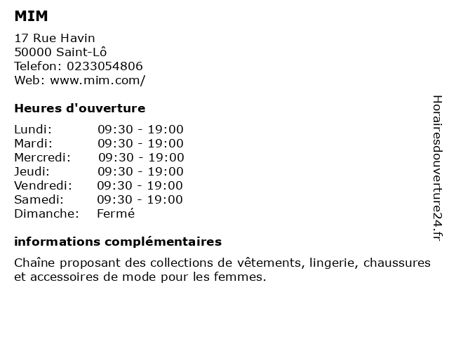 1 MIM (Distance: 48,12 km) 12 Rue Couraye, 50400 Granville accessoires, chaussures, hauts, lingerie, mim, pantalon 2 MIM (Distance: 53,53 km) 6 Rue du Moulin, 14000 Caen accessoires, chaussures, hauts, lingerie, mim, pantalon 3 MIM (Distance: 55,79 km) 34 Rue du 6 Juin, 61100 Flers accessories, chaussures, hauts, lingerie, mim, mode femme, robe 4 Mim (Distance: 56,18 km) . Saint Clair, 14200 Herouville Saint Clair accessoires, beaute&sante, cafe, chaussures, enfants, mim, mode femmes, mode hommes, optique, restaurant, service, sport 5 MIM (Distance: 57,67 km) . Rue Joseph Jacqart, 14120 Mondeville accessoires, chaussures, hauts, lingerie, mim, pantalon 6 TALLY WEiJL (Distance: 0,01 km) 17 Rue Havin, 50000 Saint-Lô denim, habits, jeans, mode, prêt à porter, robes, style, tally, tally weijl, tendances, vêtements femme, weijl |