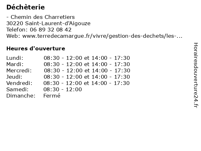 1 Déchèterie (Distance: 6,21 km) - Chemin du Bosquet, 30220 Aigues-Mortes bennes, collecte, déchèterie, gravats, huiles, tri 2 Déchèterie (Distance: 7,31 km) - Route du Pont des Tourradons, 30740 Le Cailar bennes, collecte, déchèterie, gravats, huiles, tri 3 Déchèterie (Distance: 8,00 km) - Route du Pont de l’Hôpital, 30470 Aimargues bennes, collecte, déchèterie, gravats, huiles, tri 4 Déchèterie (Distance: 11,09 km) - Rond point de l’échangeur A9, 34400 Saturargues dechets, déchèterie, ferraille, journaux, magazines, papiers, verre 5 Déchèterie (Distance: 11,31 km) - route de l'Espiguette, 30240 Le Grau-du-Roi bennes, collecte, déchèterie, gravats, huiles, tri 6 Déchèterie (Distance: 13,65 km) - route de Vauvert, 30600 Vestric-et-Candiac bennes, collecte, déchèterie, gravats, huiles, tri |
