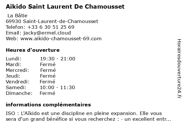 1 Aikido Saint Laurent De Chamousset (Distance: 0,00 km) La Bâtie, 69930 Saint-Laurent-de-Chamousset aikido, chamousset, de, laurent, saint 2 Aikido Saint Laurent De Chamousset (Distance: 0,33 km) Rue du Stade, 69930 Saint-Laurent-de-Chamousset aikido, chamousset, de, laurent, saint 4 Aikido De Jassans (Distance: 35,49 km) Avenue de la Plage, 01480 Jassans-Riottier aikido, de, jassans 5 Academie D'Aikido De Condrieu AAC (Distance: 38,23 km) 7 Allée Eric Tabarly, 69420 Condrieu aac, academie, condrieu, d'aikido, de |