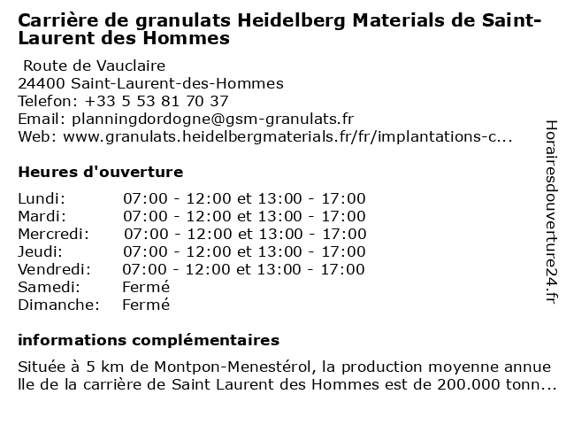 1 GSM Granulats - La carrière de Saint Laurent des Hommes (Distance: 1,62 km) 1000 route de Vauclaire, 24400 Saint Laurent des Hommes carrière, constructions, de, des, fournisseurs, granulats, gsm, hommes, la, laurent, matériaux, saint, travaux 2 Centrale à béton Heidelberg Materials de Saint-Laurent-des-Hommes (Distance: 1,66 km) Rue des Écoles, 24400 Saint-Laurent-des-Hommes béton, centrale, de, des, heidelberg, hommes, laurent, materials, saint 3 Doyeux Sablières Montponnaises - Carrière (Distance: 6,09 km) 529 Route Juliette Gréco, 24700 Montpon-Ménestérol carrière, doyeux, montponnaises, sablières 4 Centrale à béton Heidelberg Materials de Bergerac (Distance: 30,05 km) 12 Rue Denis Papin, 24100 Bergerac bergerac, béton, centrale, de, heidelberg, materials 5 Centrale à béton Heidelberg Materials de Saint-Denis-de-Pile (Distance: 34,97 km) 4 Chemin des Gravières, 33910 Saint-Denis-de-Pile béton, centrale, de, denis, heidelberg, materials, pile, saint 6 Centrale à béton Heidelberg Materials de Marsac sur l'Isle (Distance: 37,85 km) Rue Monplaisir, 24430 Marsac-sur-l'Isle béton, centrale, de, heidelberg, l'isle, marsac, materials, sur |
