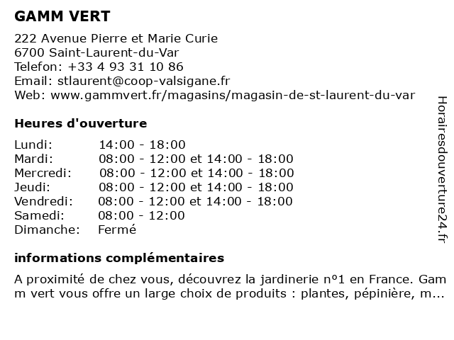 1 GAMM VERT (Distance: 4,46 km) 29 Avenue de la Gare, 06800 Cagnes-sur-Mer animalerie, basse-cour, chat, cheval, chevaux, chien, engrais, gamm, jardin, jardinerie, outils, piscine, plantes, potager, poules, pépinière, terreau, terroir, vert, volaille 3 GAMM VERT (Distance: 16,05 km) 16 Bis Avenue Georges Clemenceau, 06220 Vallauris agrumes, alimentation animale, arrosage, fleurs, gamm, insecticides, jardin, jardinerie, motoculture, nérolium, outils jardin, paillage, plantes, potager, poterie, produits ménagers, pépinière, raticides, semences, terroir, vert, équipement de sécurité 4 GAMM VERT (Distance: 16,24 km) 66 Chemin du Tram, 06390 Contes animalerie, basse-cour, chat, cheval, chevaux, chien, engrais, gamm, jardin, jardinerie, outils, piscine, plantes, potager, poules, pépinière, terreau, terroir, vert, volaille 5 GAMM VERT (Distance: 18,47 km) 509 Avenue Saint-Martin, 06250 Mougins agrumes, alimentation animale, arrosage, fleurs, gamm, insecticides, jardin, jardinerie, mobilier de jardin, motoculture, nérolium, outils de jardins, plantes, potager, poterie, produits ménagers, pépinière, raticides, semences, terroir, vert 6 Gamm vert (Distance: 19,23 km) 1 BD DU NORD, 06110 LE CANNET animalerie, animaux, gamm, horticulteur, jardin, jardinerie, vert |