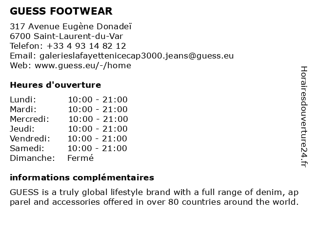 1 GUESS FOOTWEAR (Distance: 7,36 km) 6 Avenue Jean Médecin, 06000 Nice accessories, affordable shoes, best shoe store, boots, casual shoes, clothing store, comfortable shoes, fashion, footwear, footwear store, guess, guess clothing, iconic logo pieces, leather shoes, shoes, sneakers, stylish footwear, trendy shoes, wedding shoes, women's clothing 2 GUESS FOOTWEAR (Distance: 18,52 km) 6 Rue du Maréchal Foch, 06400 Cannes accessories, affordable shoes, best shoe store, boots, casual shoes, clothing store, comfortable shoes, fashion, footwear, footwear store, guess, guess clothing, iconic logo pieces, leather shoes, shoes, sneakers, stylish footwear, trendy shoes, wedding shoes, women's clothing 3 GUESS (Distance: 0,41 km) 317 Avenue Eugène Donadeï, 06700 Saint-Laurent-du-Var accessories, apparel, bag, clothes, clothing, clothing store, denim, denim store, dress, fashion, guess, guess clothing, handbags, iconic logo pieces, outerwear, sexy dresses, shoes, t-shirt, women's clothing, women's handbags 4 La Halle (Distance: 0,02 km) 1 Avenue Eugène Donadeï, 06700 Saint-Laurent-du-Var bags, child, clothing, halle, la, lingerie, man, shoes, woman 5 Petit Bateau (Centre Commercial Cap 3000 ) (Distance: 0,02 km) , avenue Eugène Donadeï, 06700 Saint Laurent Du Var 3000, bateau, cap, centre, children's clothing, commercial, men's clothing, petit, women's clothing 6 Mellow Yellow (Distance: 0,02 km) 3000 Avenue Eugene Donadei, 06700 Saint Laurent Du Var accessoires, ballerines, bottes, chaussures, enfant, escarpins, femme, mellow, sneakers, yellow |