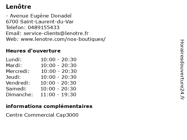 1 Lenôtre (Distance: 7,48 km) 14 avenue Félix Faure, 06000 Nice café, chaussures, enfants, lenôtre, lingerie, mode femmes, mode hommes, restaurant, sport 2 Lenôtre (Distance: 18,36 km) 63 rue d'Antibes, 06400 Cannes gateaux, lenôtre, pâtisserie, restauration 3 Le Park Cannes Mougins - Lenôtre (Distance: 16,49 km) 144 Avenue Saint Basile, 06250 Mougins cannes, domaine, le, lenotre, lenôtre, mougins, parc, park, privatisation, événement 4 Glacier Louise (Distance: 0,00 km) - Avenue Eugène Donadeï, 06700 Saint-Laurent-du-Var chocolat, crème, glace, glacier, louise, vanille 5 Tartine et Chocolat (Distance: 0,00 km) - Avenue Eugène Donadeï, 06700 Saint-Laurent-du-Var chocolat, enfants, et, mode, tartine, vêtement 6 Puyricard (Distance: 0,17 km) - Avenue Eugène Donadeï, 06700 Saint-Laurent-du-Var cadeaux, chocolat, chocolaterie, puyricard |