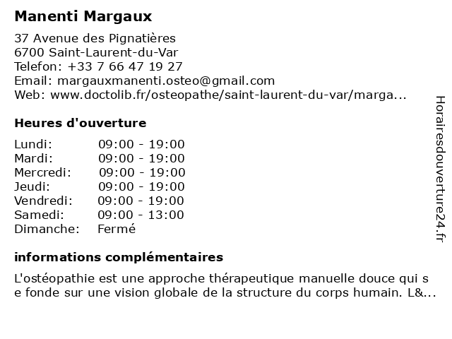 1 Margaux Minniti - Ostéopathe - secretariat (Distance: 2,28 km) 170 Boulevard Napoléon III, 06200 Nice margaux, minniti, médecin, médecine, médical, ostéopathe, pharmaceutique, secretariat, traitement 2 Margaux Girardon - Psychologue (Distance: 5,11 km) 47 Avenue du Loup, 06270 Villeneuve-Loubet folie, girardon, margaux, psychiatre, psychiatrie, psychiatrique, psychologue 3 Maître Margaux Veran - Avocate (Distance: 7,12 km) 1 rue Louis Gassin, 06300 Nice avocate, avocats, civils, droits, juridiques, margaux, maître, veran 4 Bistrot Margaux (Distance: 11,31 km) 17 Avenue du 11 Novembre, 06600 Antibes bar, bistrot, brasserie, café, margaux, restaurant, restauration 5 Margaux Le Bail - Psychologue (Distance: 12,01 km) 11 Boulevard du Président Wilson, 06600 Antibes bail, le, margaux, psy, psychiatre, psychologue, sante, soins 6 Margaux Gabriel - Psychologue (Distance: 16,79 km) 1935 Route de Châteauneuf-Villevieille, 06690 Tourrette-Levens folie, gabriel, margaux, psychiatre, psychiatrie, psychiatrique, psychologue |