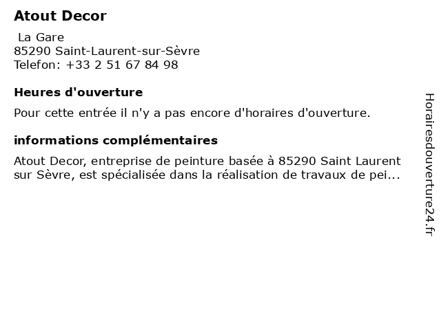 1 Atout Menage (Distance: 7,51 km) 20 Rue du Coteau, 49280 La Tessoualle aide, atout, domicile, menage, personne, service 2 ASF - Atout Stores & Fenêtres (Distance: 10,87 km) 13 bis Av. de l'europe, 49300 Cholet asf, atout, entrepreneur spécialisé dans les clôtures, fenêtres, magasin de stores, pose de fenêtres, stores, vente de volets 4 Atout Paysage EURL (Distance: 19,53 km) 39 Rue Eric Tabarly, 49450 Saint-Macaire-en-Mauges atout, eurl, paysage 5 L' Envers du Décor (Distance: 12,03 km) 23 rue de la Bienfaisance, 85500 Les Herbiers decor, du, décor, envers, français, gastronomique, l', restaurant 6 |
