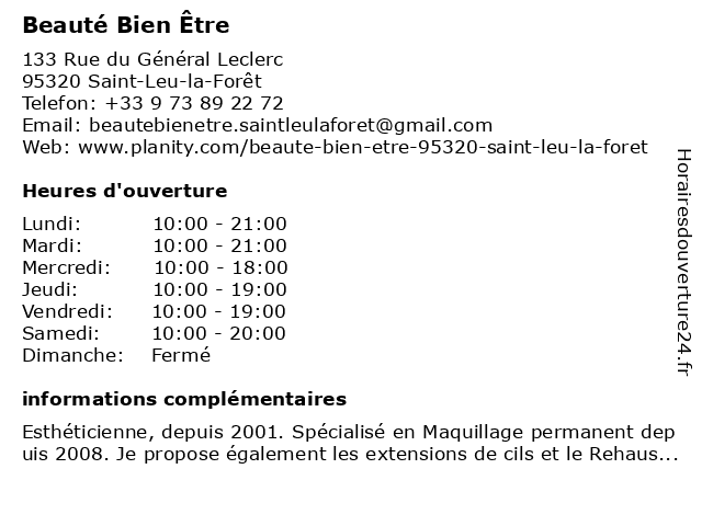 1 Anna Beauté Coiffure (Distance: 0,56 km) 44 Avenue de la Gare, 95320 Saint-Leu-la-Forêt anna, beauté, coiffeur, coiffure, coloration, coupe, shampooing 2 Institut de beauté Bodyminute / Nailminute (Distance: 1,53 km) Rue Anne Joseph Theroigne de Méricourt, 95150 Taverny beauté, bodyminute, de, institut, nailminute 4 La Touche Étoile - Massages et bien-être (Distance: 3,07 km) 123 Rue du Plessis-Bouchard, 95130 Franconville bien, bien-etre, et, etoile, la, massages, relax, sante, touche, étoile, être 5 Institut de beauté Adam & Eve (Distance: 6,69 km) 114 Avenue du Maréchal Joffre, 95100 Argenteuil adam, beauté, de, eve, institut 6 Institut de beauté Bodyminute / Nailminute (Distance: 8,10 km) Avenue Robert Schuman, 95350 Saint-Brice-sous-Forêt beauté, bodyminute, de, institut, nailminute |