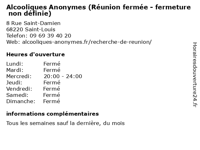 Termes de recherche pour Alcooliques Anonymes (Réunion fermée - fermeture non définie):reunion, non, fermeture, alcooliques, anonymes, définie, fermée |