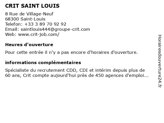 1 CRIT MULHOUSE Industrie (Distance: 22,95 km) 2 Rue Louis Pasteur, 68100 Mulhouse crit, industrie, mulhouse 3 CRIT DIDENHEIM Tertiaire, Commerce et Agro (Distance: 24,34 km) 9-11 Avenue de Strasbourg, 68350 Brunstatt-Didenheim agro, commerce, crit, didenheim, et, tertiaire 4 CRIT DIDENHEIM Automobile - Industrie (Distance: 24,34 km) 9-11 Avenue de Strasbourg, 68350 Brunstatt-Didenheim automobile, crit, didenheim, industrie 5 Crit Job - Tertiaire (Distance: 25,42 km) 20 rue de Chemnitz, 68200 Mulhouse agence, crit, emplois, intérim, job, offres, tertiaire 6 Crit (Agence Intérim) (Distance: 41,64 km) 8 place de Lattre de Tassigny, 68800 Thann agence, crit, d'intérim, intérim |