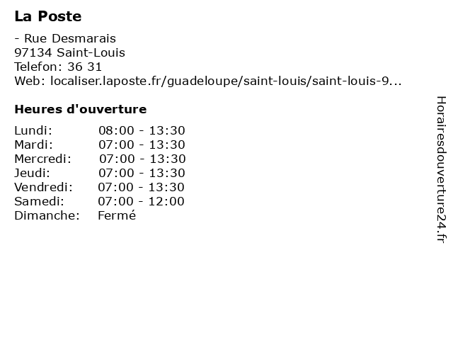 1 La Poste (Distance: 8,01 km) - Rue du Dr Marcel Etzol, 97112 Grand-Bourg agence, colis, courriers, expédition, la, postale, poste, relais 2 La Poste (Distance: 12,15 km) s/n Rue Ceran Rosmade, 97140 Capesterre-de-Marie-Galante agence, banque, bureau de poste, colis, courrier, expéditions internationales, la, point, postale, poste, relais 3 La Poste (Distance: 31,01 km) - Place Schœlcher, 97180 Sainte-Anne agence, colis, courriers, expédition, la, postale, poste, relais 4 La Poste (Distance: 35,49 km) - Route de Bragelogne, 97180 Sainte-Anne agence, colis, courriers, expédition, la, postale, poste, relais 5 La Poste (Distance: 39,55 km) - Rue Gerville Reache, 97114 Trois-Rivières agence, colis, courriers, expédition, la, postale, poste, relais 6 La Poste (Distance: 40,61 km) - Rue Pierre Fidelin, 97141 Vieux-Fort agence, colis, courriers, expédition, la, postale, poste, relais |