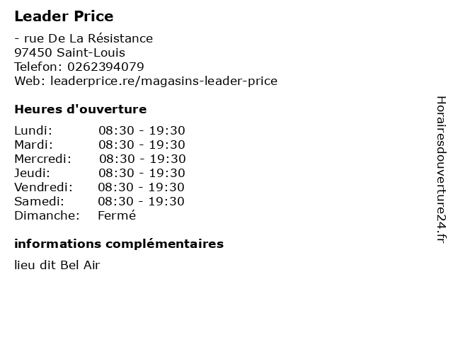 1 Leader Price (Distance: 6,36 km) 51 rue Du Père Maitre, 97432 Ravine-des-Cabris discount, fruits, leader, légume, price, supermarché, épicerie 2 Leader Price (Distance: 7,68 km) 1 bis rue Payet, 97414 Entre-Deux dessert, frais, leader, légume, price, salée, sucrée, supermarché, surgelés, vente, épicerie 3 Leader Price (Distance: 8,16 km) 19 Centre commercial Casabona, 97410 Saint-Pierre discount, fruits, leader, légume, price, supermarché, épicerie 4 Leader Price (Distance: 8,50 km) 52 rue Voltaire, 97421 Les Makes discount, fruits, leader, légume, price, supermarché, épicerie 5 Leader Price (Distance: 11,00 km) 344 rue Hubert Delisles, 97430 Le Tampon dessert, frais, leader, légume, price, salée, sucrée, supermarché, surgelés, vente, épicerie 6 Leader Price (Distance: 11,74 km) 49 route Hubert Delisle, 97430 Le Tampon dessert, frais, leader, légume, price, salée, sucrée, supermarché, surgelés, vente, épicerie |