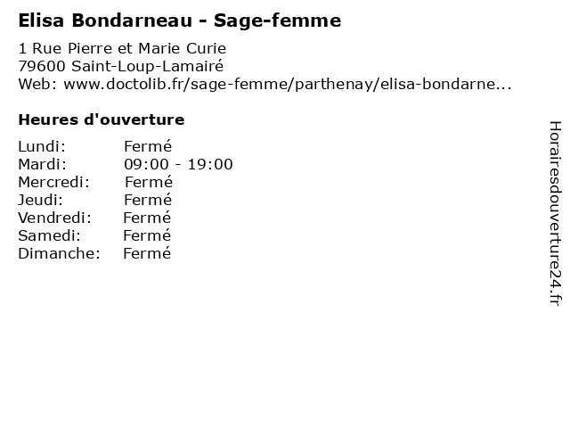 1 Elisa Bondarneau - Sage-femme (Distance: 15,13 km) 2 Rue de la Chauvelière, 79200 Parthenay bondarneau, elisa, femme, medical, sage, sagefemme 2 Dr. Elisa Larrieu Ardilouze -Cardiologie (médecine et chirurgie cardio-thoracique) – Consultations hospitalières (Distance: 48,13 km) 2 Rue de la Milétrie, 86000 Poitiers ardilouze, cardio, cardiologie, chirurgie, consultations, docteur, dr., elisa, et, hospitalières, larrieu, medecins, médecine, sante, thoracique 3 Dr. Elisa Larrieu Ardilouze - Cardiologie (médecine et chirurgie cardio-thoracique) – Echographie cardiaque (Distance: 48,13 km) 2 Rue de la Milétrie, 86000 Poitiers ardilouze, cardiaque, cardio, cardiologie, chirurgie, docteur, dr., echographie, elisa, et, larrieu, medecins, médecine, sante, thoracique 4 Elisa Tartre-Langlais - Sage-femme (Distance: 57,03 km) - Rue de la Poste, 86800 Saint-Julien-l'Ars elisa, femme, langlais, medical, sage, sagefemme, tartre 5 Julie Fuzeau - Sage-femme (Distance: 0,00 km) 1 Rue Pierre et Marie Curie, 79600 Saint-Loup-Lamairé femme, fuzeau, julie, sage, sagefemme, sante 6 Julie Loiseau - Sage-femme (Distance: 1,40 km) 1 Rue Pierre et Marie Curie, 79600 Saint-Loup-Lamairé femme, julie, loiseau, medical, sage, sagefemme |