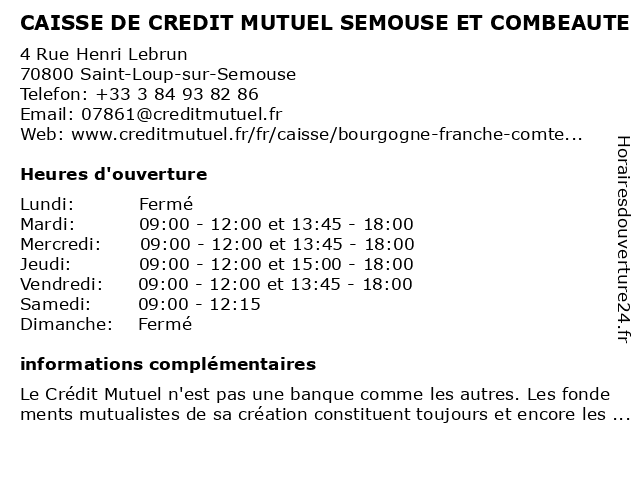 1 Crédit Mutuel (Distance: 0,01 km) 4 Rue Henri Lebrun, 70800 St Loup Sur Semouse compagnie de téléphone, crédit, mutuel, organisme d'assurance 2 Caisse d'Épargne (Distance: 0,18 km) 20 Place Léon Jacquey,, 70800 Saint-Loup-sur-Semouse banque, caisse, carte, d'epargne, d'épargne, services 3 CAISSE DE CREDIT MUTUEL SEMOUSE ET COMBEAUTE - FOUGEROLLES (Distance: 9,94 km) 6 Rue de la Gare, 70220 Fougerolles-Saint-Valbert caisse, combeaute, credit, de, et, fougerolles, mutuel, semouse 4 Crédit Mutuel (Distance: 9,95 km) 6 Rue De La Gare, 70220 Fougerolles compagnie de téléphone, crédit, mutuel, organisme d'assurance 5 Crédit Mutuel (Distance: 11,29 km) 30 Rue Jules Jeanneney, 70300 Luxeuil-les-Bains agence, assurance, bancaire, banque, crédit, mutuel 6 Crédit Mutuel (Distance: 11,29 km) 30 Rue Jules Jeanneney, 70300 Luxeuil Les Bains compagnie de téléphone, crédit, mutuel, organisme d'assurance |