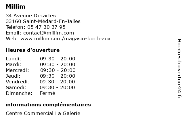 1 Millim (Distance: 0,27 km) 34 Avenue Descartes, 33167 Saint-Médard-en-Jalles centre, commercial, galerie, leclerc, medard, millim, saint 2 Millim (Distance: 35,30 km) - Route de Bordeaux, 33740 Ares accessoires, chaussures, magasin, millim, mode, prêt à porter 3 Orchestra SAINT MEDARD EN JALLES (Distance: 0,03 km) 34 Avenue René Descartes, 33160 Saint-Médard-en-Jalles bébé, en, enfant, jalles, medard, mode, orchestra, prémaman, prêt à porter, puericulture, saint, vêtements 4 Darjeeling Saint-Médard-en-Jalles Bordeaux Ouest (Distance: 0,17 km) Avenue Descartes, 33160 Saint-Médard-en-Jalles bordeaux, darjeeling, en, jalles, magasin de maillots de bain, magasin de vêtements de maternité, magasin de vêtements grandes tailles, magasin de vêtements pour femmes, médard, ouest, saint 5 Opticien Krys (Distance: 0,19 km) 34 Avenue René Descartes, 33160 Saint-médard-en-jalles krys, magasin de lentilles correctrices, magasin de lunettes de soleil, magasin d’accessoires de mode, opticien, optométrie 6 E.Leclerc Espace Culturel (Distance: 0,20 km) 34 avenue Descartes, 33160 Saint-Médard-en-Jalles culturel, e.leclerc, espace, fournisseur de matériel audiovisuel, librairies, magasin de jeux vidéo, magasin de musique, matériel de photographie, matériel vidéo, services et matériel vidéo |