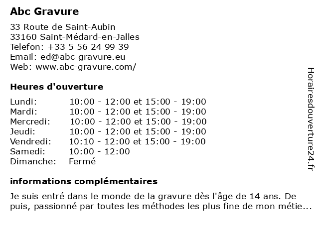 1 ABC Gravure (Distance: 0,41 km) 33 route de Saint-Aubin, 33160 Saint Médard-en-Jalles abc, abc gravure, enseigne, gravure, impression, publicité 4 Abc-dessin-peinture (Distance: 12,62 km) 36 Avenue Gabrièle d'Annunzio, 33600 Pessac abc, dessin, peinture 5 DU NEUF AVEC L'ANCIEN - ABC IMMODIAG (Distance: 13,05 km) 7 Allées de Chartres, 33000 Bordeaux abc, avec, du, immodiag, l'ancien, neuf 6 L'Atelier de François - Gravure campagnol (Distance: 13,38 km) 190 Rue du XIV Juillet, 33400 Talence campagnol, de, françois, gravure, l'atelier  |