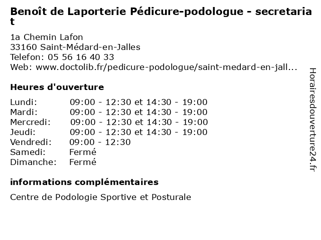 1 Margaux Massaloux Pédicure-podologue - secretariat (Distance: 0,00 km) 1a Chemin Lafon,, 33160 Saint-Médard-en-Jalles margaux, massaloux, médecin, médecine, médical, pharmaceutique, podologue, pédicure, secretariat, traitement 2 Svana Bureau - Pédicure-podologue - secretariat (Distance: 0,01 km) 1a Chemin Lafon,, 33160 Saint-Médard-en-Jalles bureau, médecin, médecine, médical, pharmaceutique, podologue, pédicure, secretariat, svana, traitement 3 Patricia Dagoreau - Pédicure-podologue - secretariat (Distance: 0,01 km) 1a Chemin Lafon,, 33160 Saint-Médard-en-Jalles dagoreau, médecin, médecine, médical, patricia, pharmaceutique, podologue, pédicure, secretariat, traitement 4 Jean Gil Pinel Pédicure-podologue- secretariat (Distance: 0,70 km) 15 Avenue Montaigne,, 33160 Saint-Médard-en-Jalles gil, jean, médecin, médecine, médical, pharmaceutique, pinel, podologue, pédicure, secretariat, traitement 5 Notaire - Benoît GARRAUD - Saint-Médard-en-Jalles (Distance: 1,58 km) 172 Avenue Montaigne, 33160 Saint-Médard-en-Jalles benoît, en, garraud, jalles, médard, notaire, saint 6 Katy Caine - Pédicure-podologue (Distance: 4,92 km) 101 Avenue du Taillan, 33320 Eysines caine, katy, pedicure, pied, podologue, pédicure, sante |